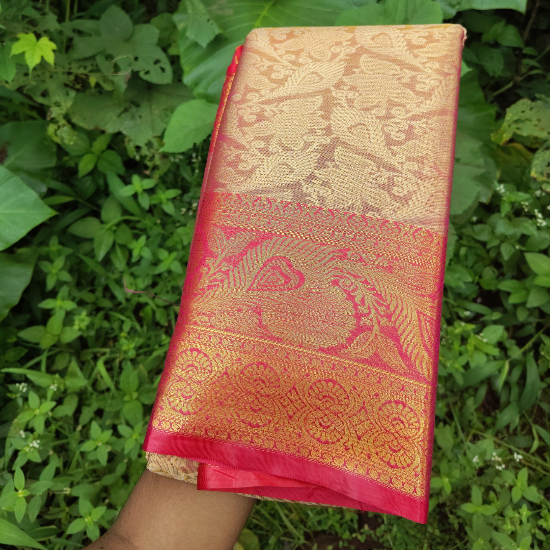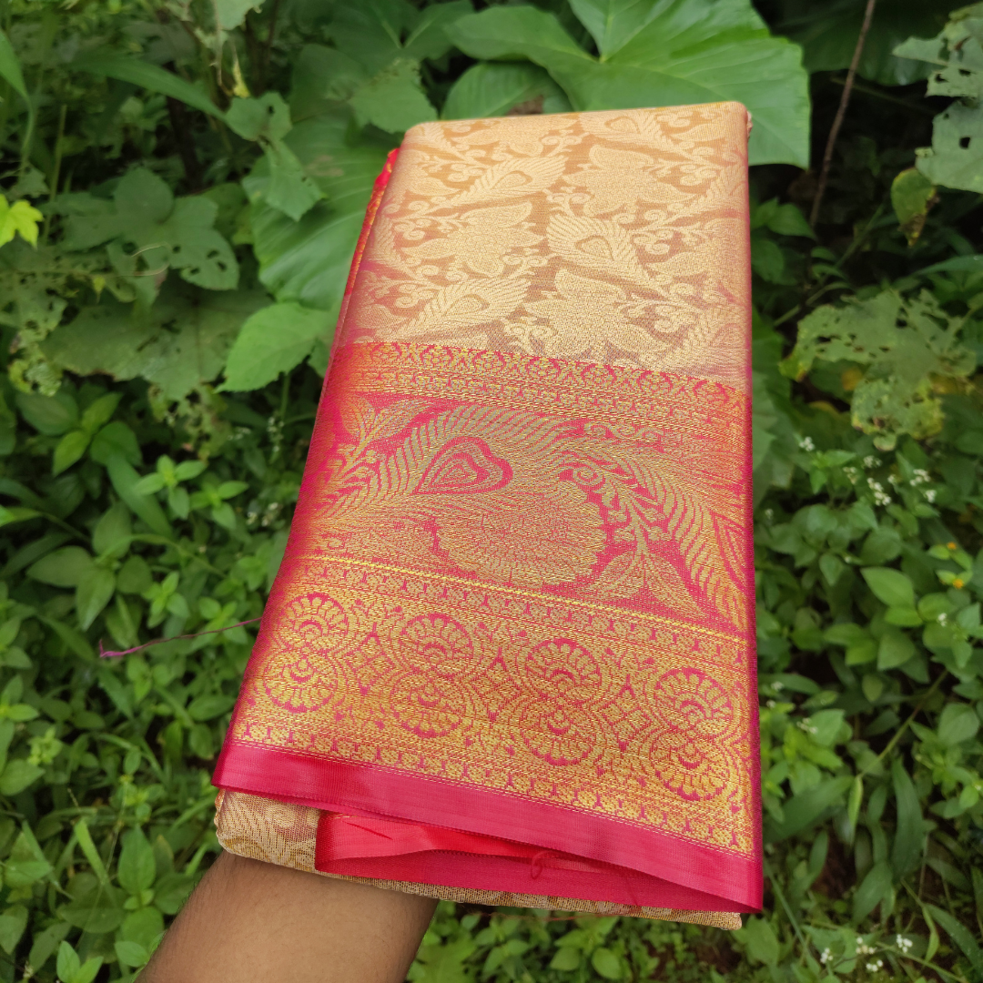 This exquisite soft silk saree features a warm golden color with a rich, detailed zari weave. The wide, contrasting rani pink border is adorned with intricate golden peacock and floral motifs. The pallu is a lavish extension of the body's design with a striking rani pink panel. The rich fabric has a beautiful drape, ideal for wedding saree events and grand celebrations. The detailed weaving and vibrant colors are a testament to traditional craftsmanship. 📹 Video Call available for model checking. Discover the joy of traditional artistry and modern elegance when you buy saree online from Vaidehi Vastra. Shop this saree online at www.vaidehivastra.com