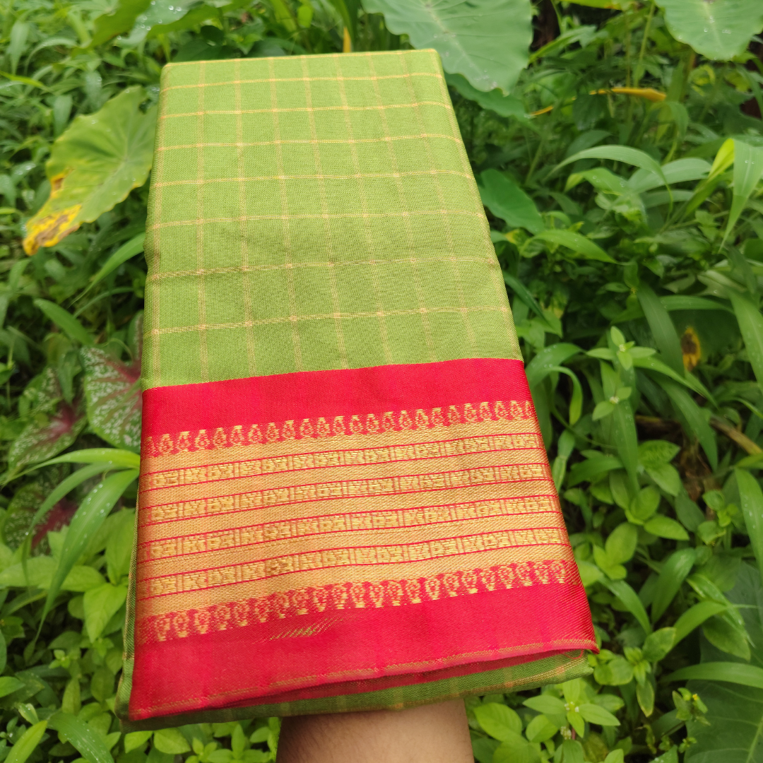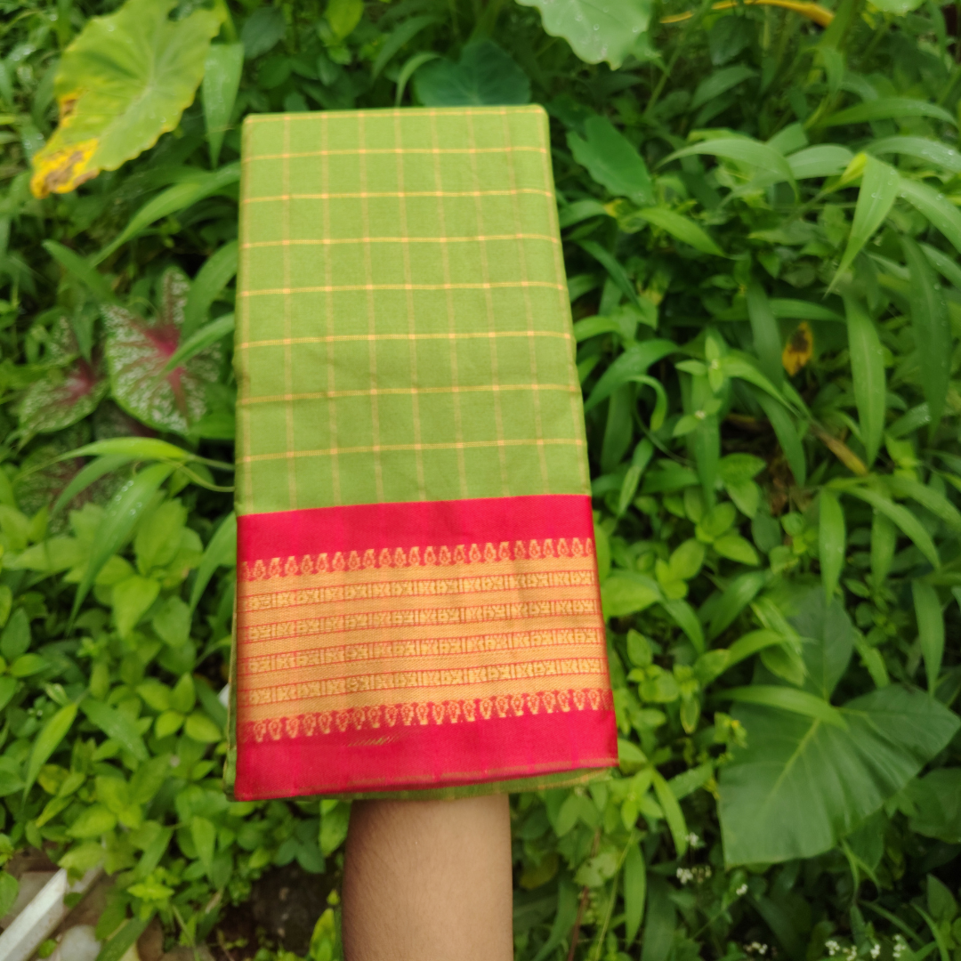 Embrace timeless elegance with the Vaidehi Vastra Pastel Green Chettinad Cotton Silk Saree. This exquisite saree features a delicate pastel green body with a classic checkered pattern, highlighted by a rich green and golden zari border. Perfect for festive wear, party wear, and traditional events, this soft silk saree offers a graceful drape and a luxurious feel. It comes with a matching blouse piece. ✨ Cash on Delivery (COD) available. 📹 Video Call available for model checking. Buy this beautiful Chettinad Cotton Silk Saree online and add a touch of sophistication to your collection.